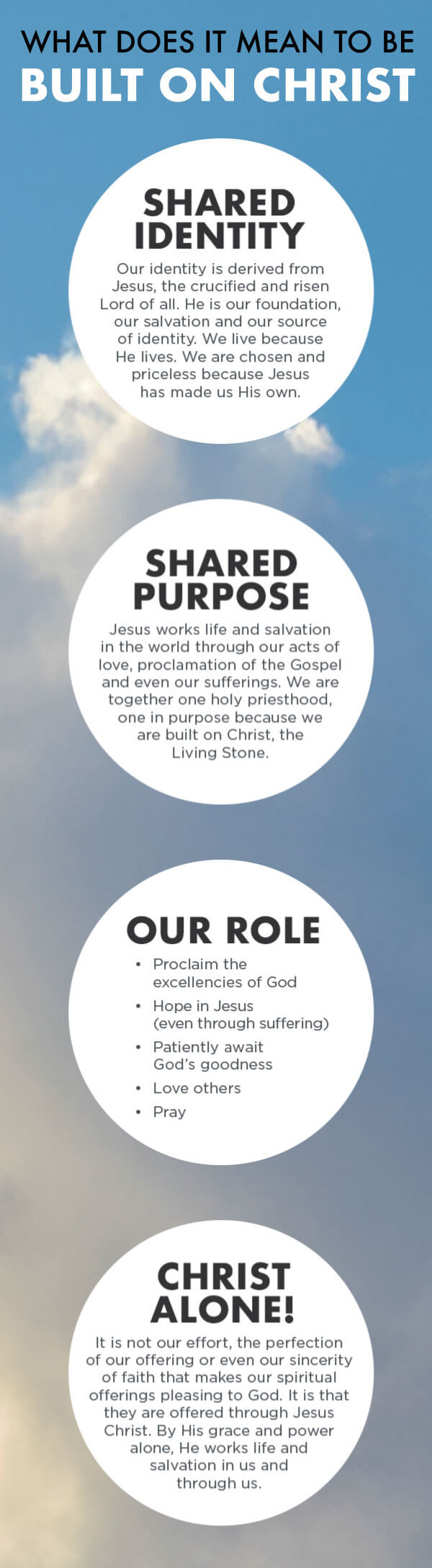 It can be easy to feel isolated and alone — as people, as congregations, even as a Synod. Sometimes we can struggle in the face of trials and the evils of sin, both in the world around us and in our own hearts. And, especially in modern times, it can be increasingly difficult to understand what it means to live faithfully as Christians in a culture that is constantly tempting us to seek power over others, to act in self-righteous anger and to find our identity in anything and everything other than Christ alone. Jesus works through us, His people, to point others to His cross and His salvation alone for hope, life and peace. Christ is the Living Stone, building us together. He is our identity, our life, our purpose — our everything.